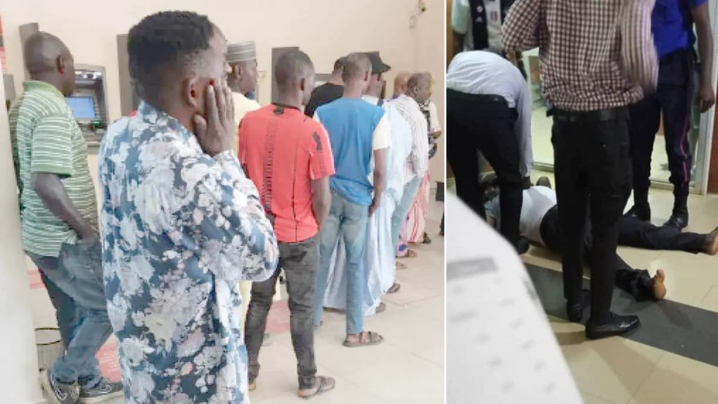 - Pix(above, R-L): The victim sprawling on the bank’s floor and the queue from which he slumped